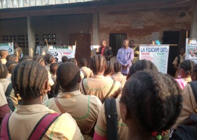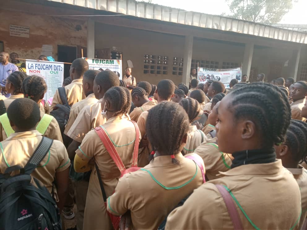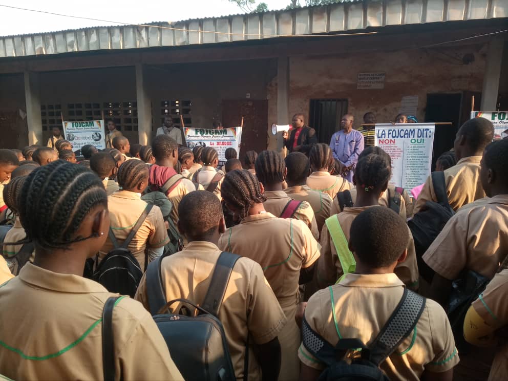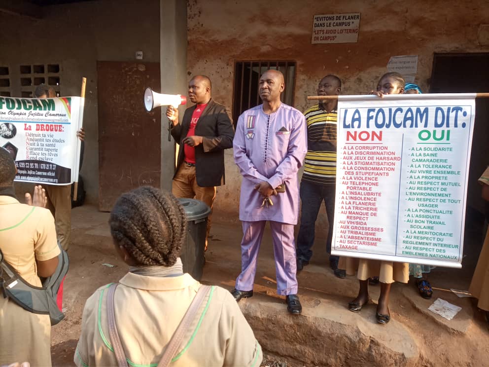 Invitée par Madame KANKEU HÉLÈNE, Proviseur du Lycée Bilingue de NGOUACHE, Bafoussam , une équipe opérationnelle d’agents bénévoles FOJCAM conduite par SIGNE ETIENNE a tenue une causerie éducative dans cet établissement scolaire d’enseignement secondaire ce lundi 6 février 2022 au cours la cérémonie de levée de couleurs dans la cours du campus B ; Initiée par l’administration de cet établissement après l’accord favorable marqué par le comité FOJCAM de contribuer à la réduction des violences, l’incivisme et la consommation des stupéfiants par les élèves de ce lycée.